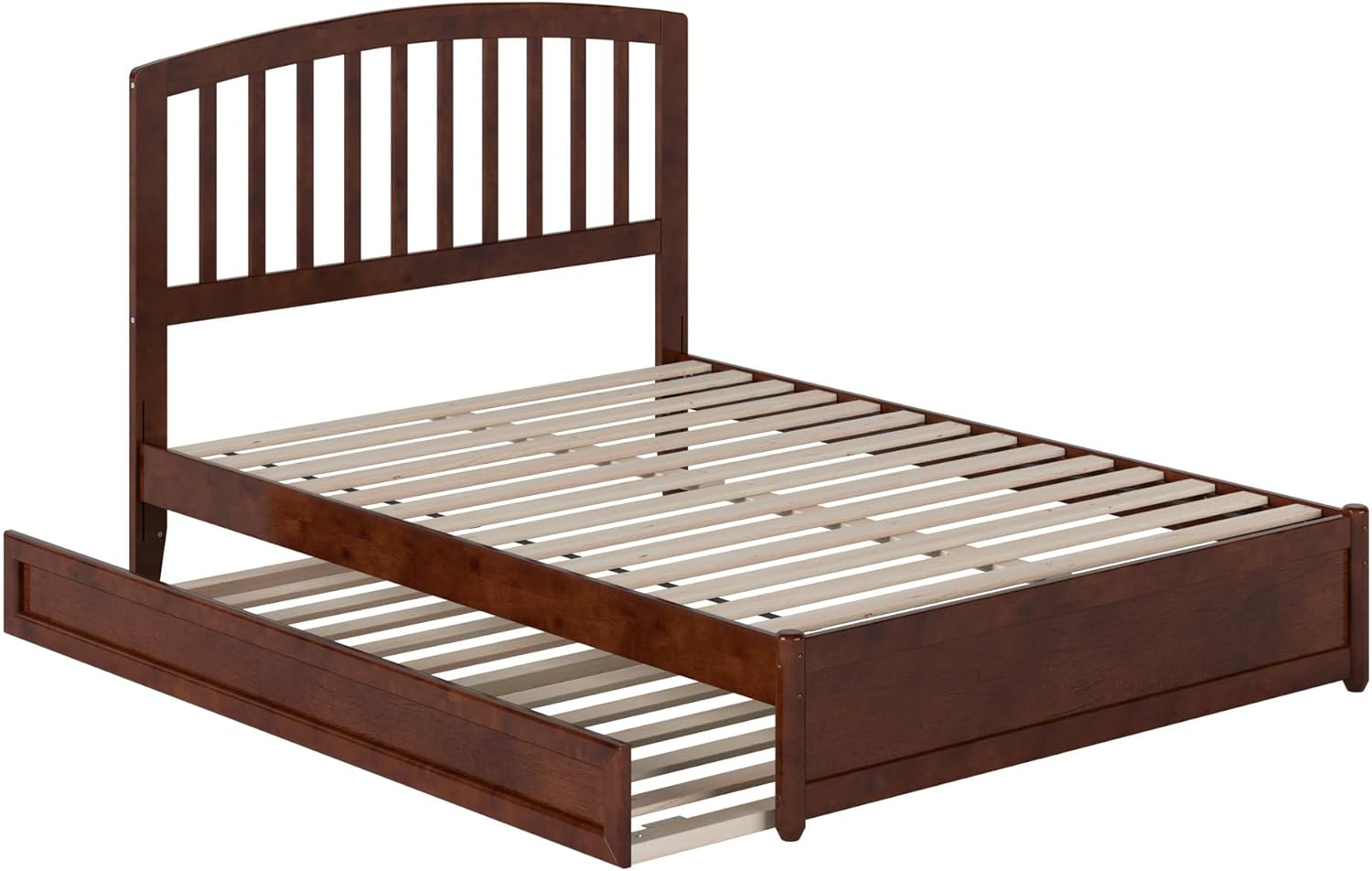 Experience the timeless elegance and sophistication of the Lucia Solid Wood Platform Bed with Panel Footboard and Trundle. This remarkable bed seamlessly combines classic, mission-inspired craftsmanship with modern, practical design. The Lucia features a slatted headboard with a graceful, rounded top, adding a refined touch to any bedroom. Crafted from solid hardwood and veneers, this bed is built for long-lasting strength and style. A trundle slides out smoothly from either side of the frame, offering a convenient sleeping space for guests. With a supportive slat kit, the Lucia is mattress-ready and does not require a box spring or foundation. Available in White, Walnut, and Light Toffee finishes and in Twin, Twin XL, Full, Queen, and King sizes, the Lucia Platform Bed is a versatile centerpiece for your home.