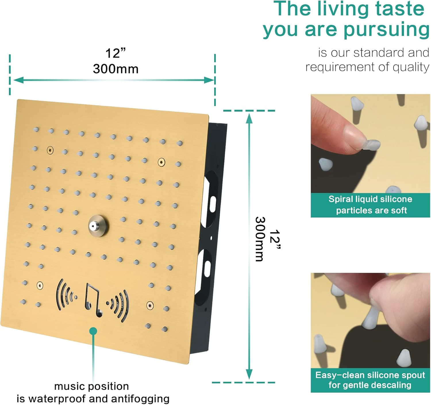 4 Mode Function Rainfall Mode Mist Outlet Body Jets Spray HandShower Technical Details Brand Name: Cascada Showers Product Number: CSLEDM6677D Color: LED Color Change by Remote Control Product Dimensions: 12 x 12 x 3/4 inches Size: 12"x12" Material: Stainless Steel Shape: Square Finish: Polished Chrome, Brushed Nickel, Matt Black, Polished Gold, Brushed Gold, Rose Gold, Oil Rubbed Bronze, and Antique Brass Water Flow Rate (gallons per minute): 1.8 Gallons per minute (GPM) per each function. Installation Method: Screw-In / Ceiling Mount Maximum Pressure: 120 PSI Hose Length: 60 inches Handle/Lever Placement: Center Number of Handles: 5 Batteries Included? No Batteries Required? No Package include: 1.12” x 12” Led Showerhead with built-in Bluetooth speaker (1 Piece) 2.1 x hand shower + ss shower hose+ brass holder 3.1 x brass 5-knob thermostatic mixer with embedded box 4. 6 x adjustable Body jets (2 Inch) 5.1 x led remote controller without battery