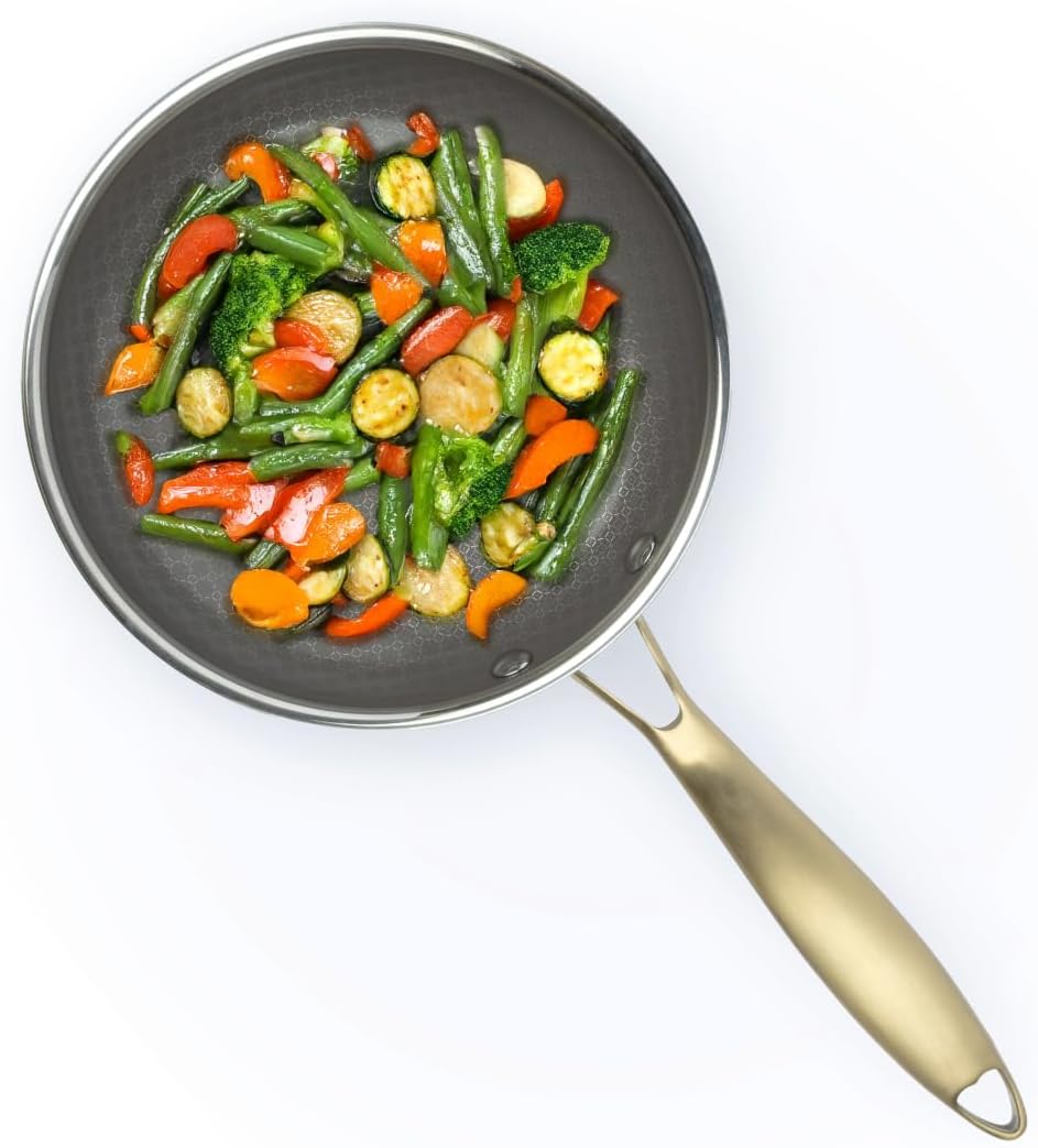 Patented Laser Etched Geometric Pattern, Created by Stainless Steel Peaks Over non-Stick CERAMIC Valleys for superior searing and easy clean up Ultra tough Ceramic coating that is long lasting with easy to clean PFAS, PFOA & PTFE FREE NON-STICK Full Tri-Ply Clad boidy with a thick aluminum core between premium stainless steel for even heat distribution