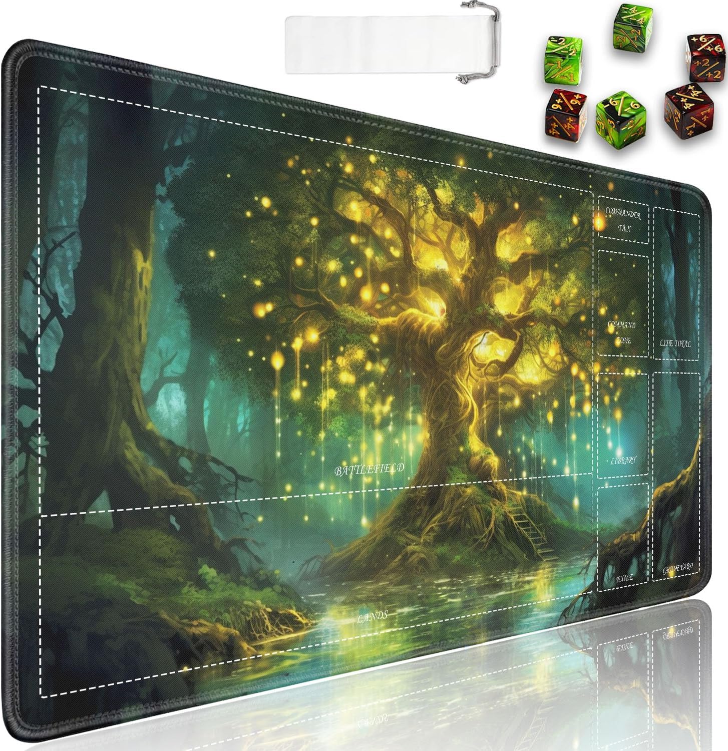 Perfect for use at home or on the go, our playmat provides card gamers with an organizer bag that rolls up the mat for storage and also protects it from dust, wrinkles and creases. It also comes with 6 dice counters. Crafted from premium materials, our playmats feature a non-slip backing and high-quality printing, a smooth surface for easy shuffling and to protect your deck from scratches and damage. So if you're looking for a cost-effective game mat or a great gift, check it out!