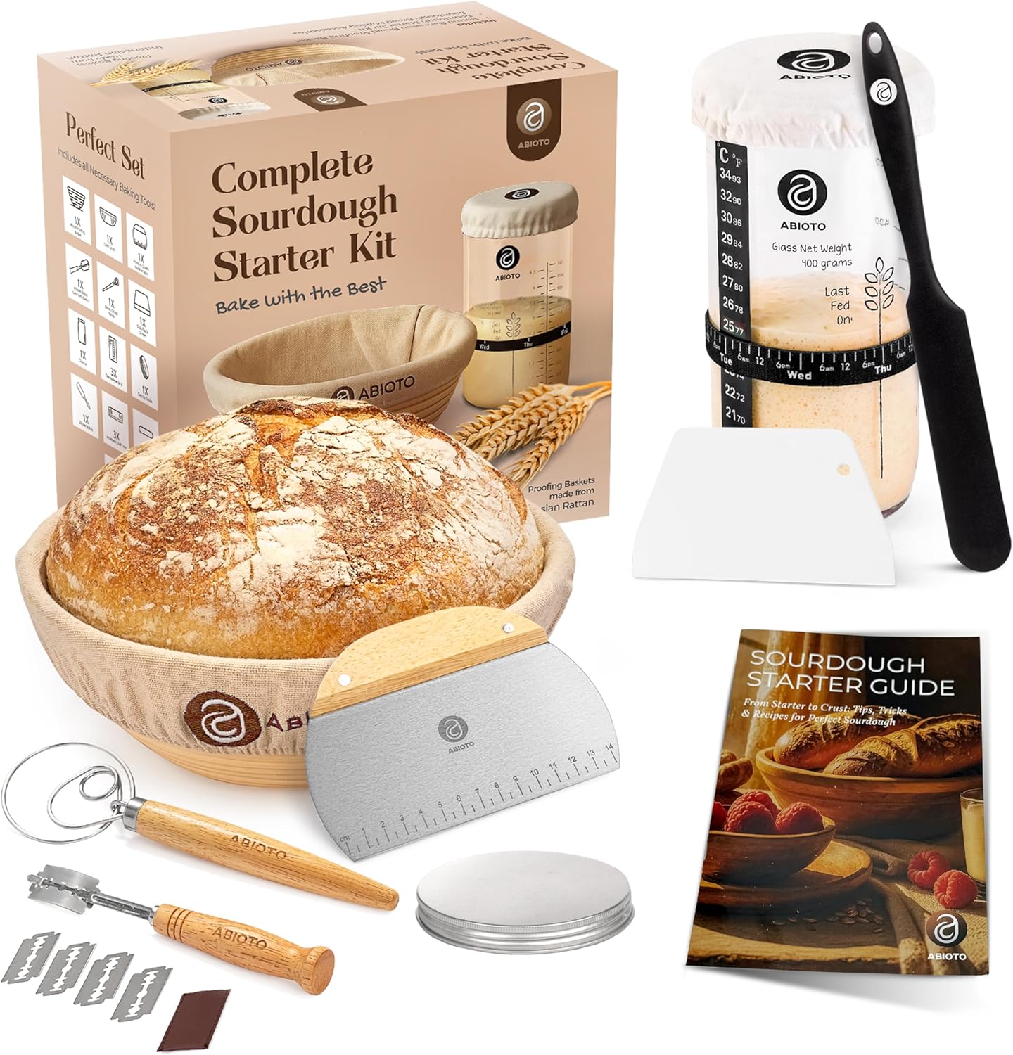 | Included Components | 24oz Glass Sourdough Starter Jar with Aluminum Lid & Breathable Cover, 9" Round Rattan Proofing Basket with Liner, Silicone Sling, Bread Lame with 5 Blades & Cover, Danish Dough Whisk, Day Tracking Band, Metal Dough Scraper, Baking Mat, Plastic Bowl Scraper, Recipe Book, Silicone Spatula, Thermometer Strip |