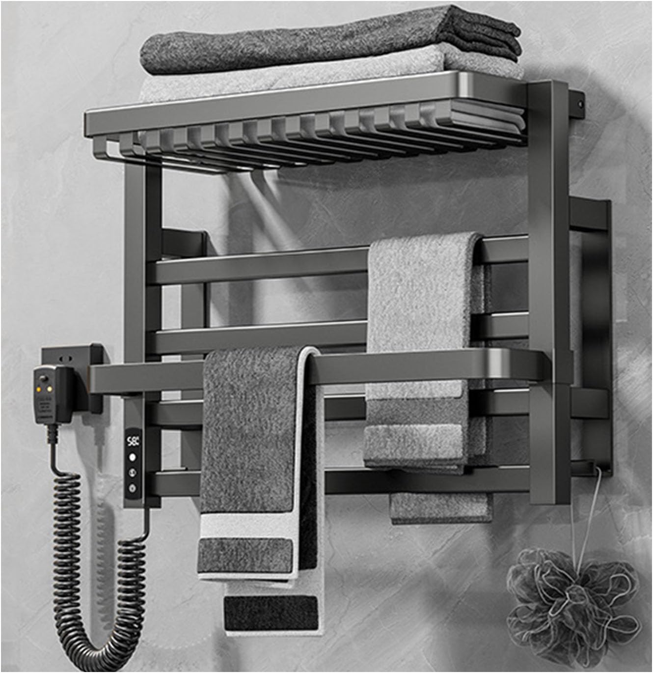 Product name: Electric towel rack for household bathroom, punch-free heating and drying, bathroom storage rack, wall-mountedColor: black, whiteMaterial: aluminum alloySurface process: high-temperature sprayingHeating method: carbon fiber heatingPreheating time: 5-8 minProduct power: 100 WPower cord: 1.3 mScope of application: bathroom, kitchen, balcony, toilet, swimming pool, hotel and other places, simple design, multi-functional usePackage content:1* Towel heater1* Installation accessoriesNote:1.Due to manual measurement, the size error is 1-3cm. Errors may occur, please refer to the actual product.2. Due to monitor settings and lighting conditions, the color may be slightly different from the listed photos